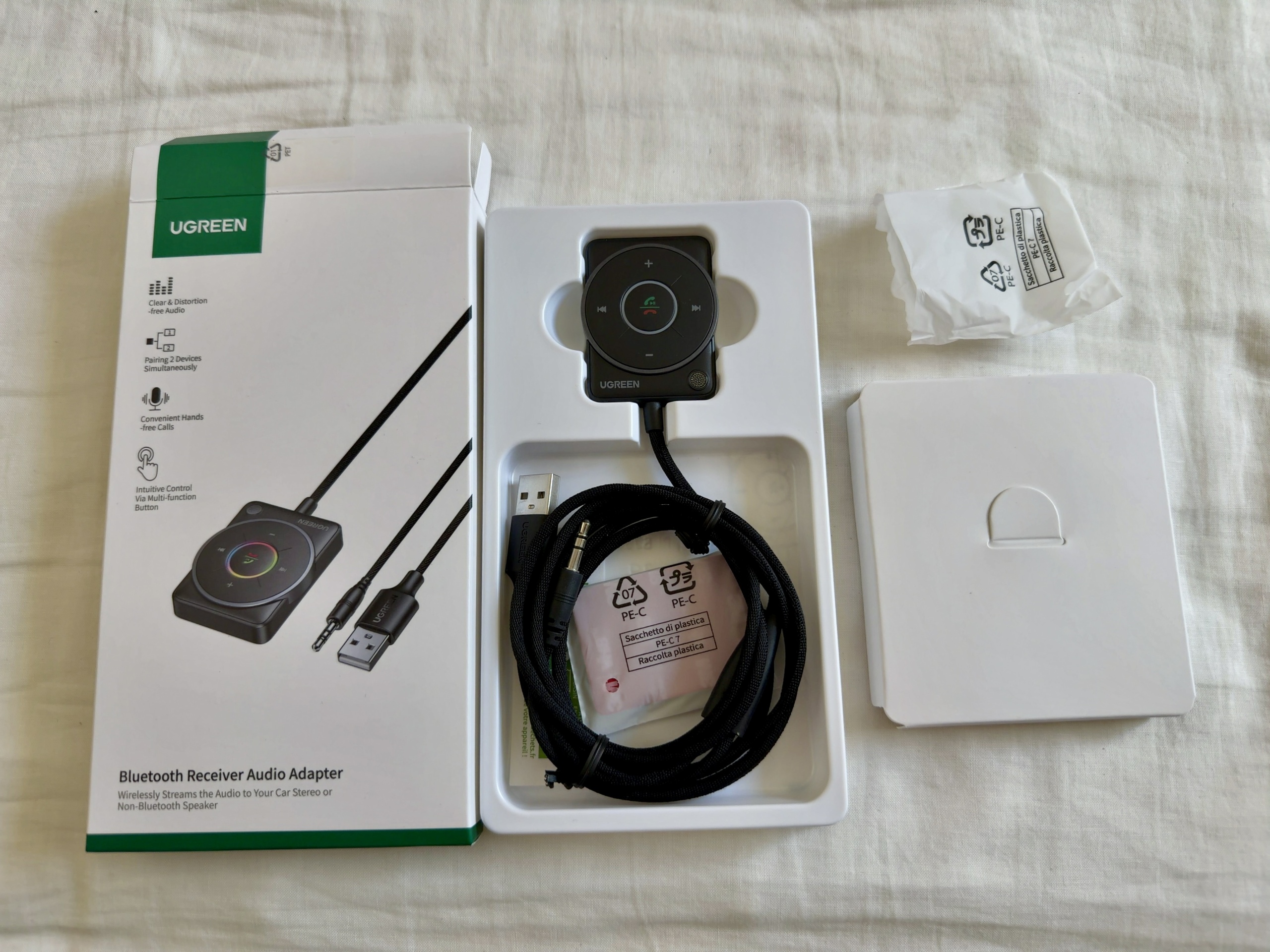 Bluetoothレシーバーとリモコンを兼ねた製品のようだ。このレシーバーから出ているオーディオ端子をELECTRONICX社製アダプタに繋げば、Bluetoothによる音楽再生とリモコン制御ができるようになる。これは便利だ。本体で制御できない残念さも、リモコン制御が可能になるなら我慢できる。