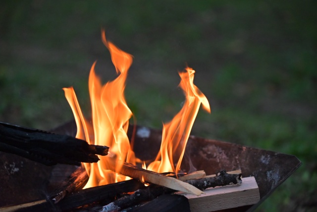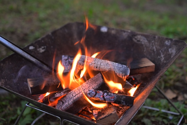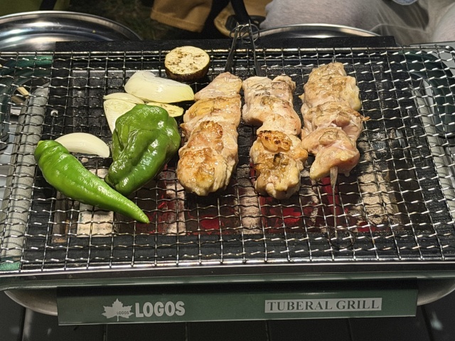 日が暮れたので晩飯にする。先日ワットマンで買ってきた中古のロゴスのコンロにオガ炭を移してBBQにする。