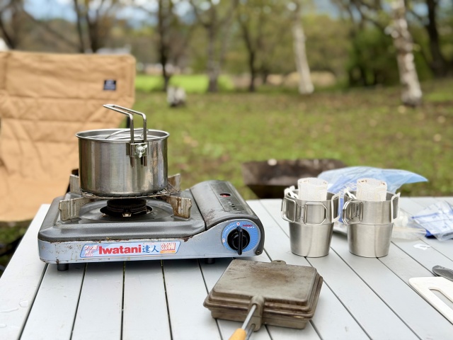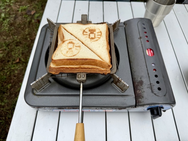 テント内を片付けてから外に出る。快適な温度だ。朝飯はいつものホットサンドにする。
