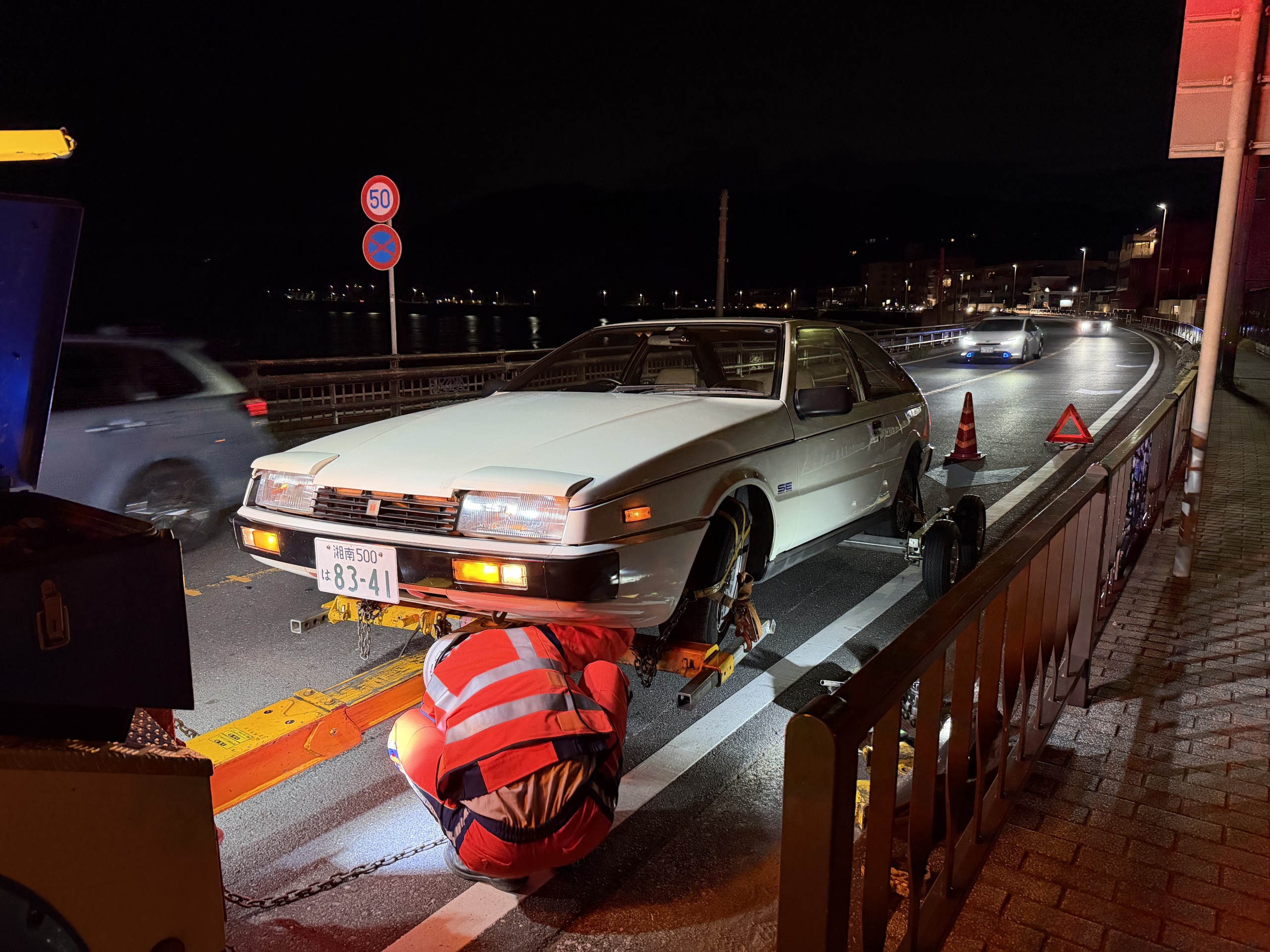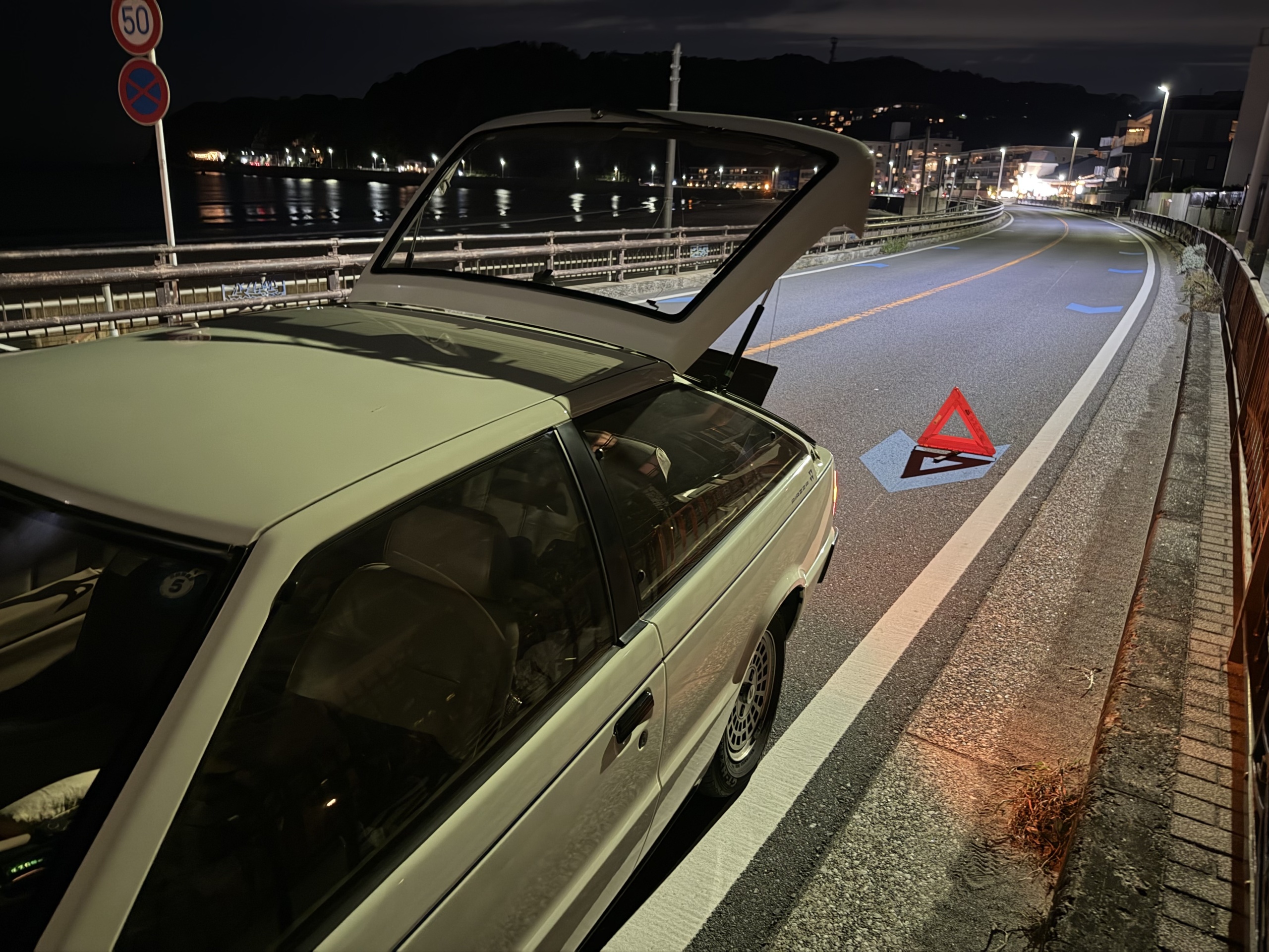 実質何もできないまま、ピアッツァはその場で不動状態になった。幸いなことに直後に他車はいなかった。まずハザードランプを点け、ハッチゲートオープナーを引き、後方を確認して外に出て、ハッチゲートを開けて三角表示板を出す。たまたま工具が自宅にある状態なので、荷室に邪魔なものがなく出しやすい。組み立てた三角表示板をピアッツァから数メートル離れたところに置く。