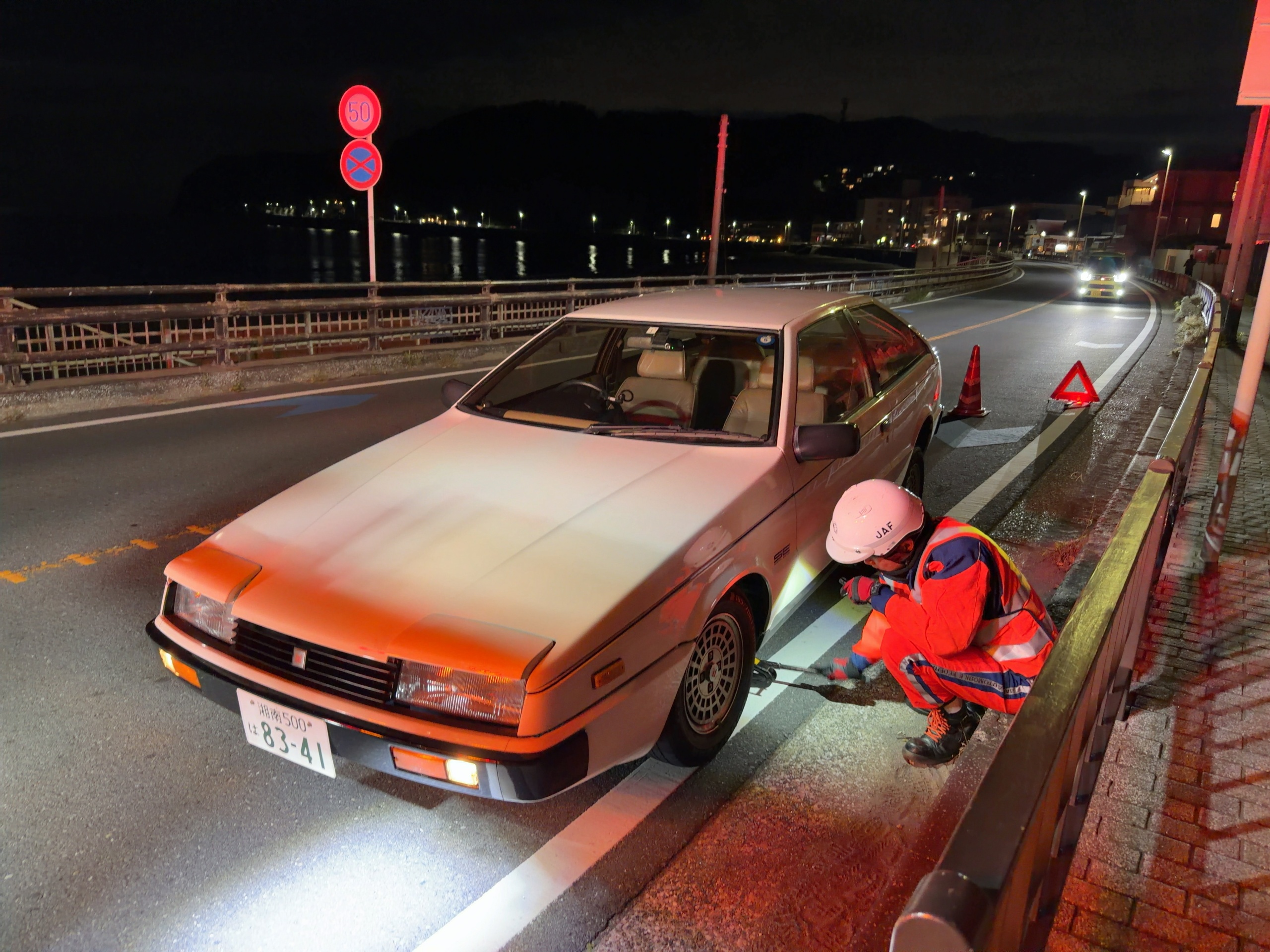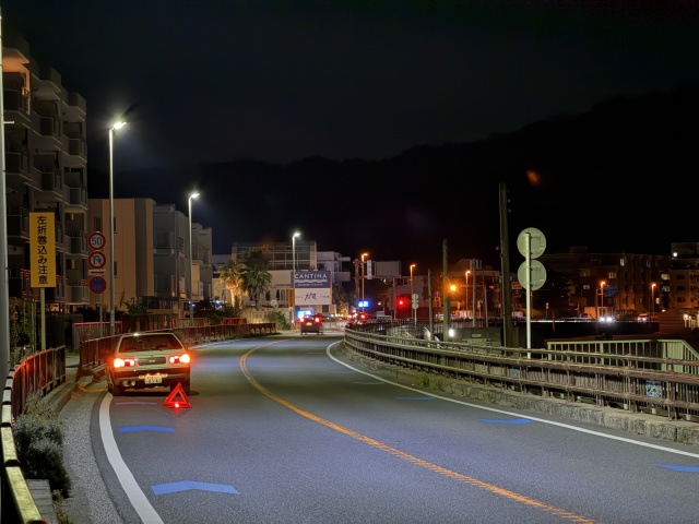 外でボケーとしていると警察が来た。何しろ動かすことができないので警察も勿論何もできない。これが交通整理が必要な状況だったら何かしてくれたのかもしれないけど、そこまでの状況でもない。パトカーの赤灯が目立っている間に運転席ドアポケットからエーモンの非常信号灯を出し、三角表示板の前に立てる。これで警察的には満足したのか、あとはJAFとよろしくやってください、ということになって去ってしまった。