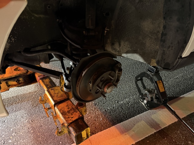 おそらく20代後半ぐらいと思われる隊員さんは、状況を見て手際よく準備を始める。まずはジャッキアップして故障箇所を確認する。フロント側はジャッキが入らないほど車高が落ちていたので一旦リヤ側を上げ、次いでフロントを上げ、さらにホイールを外す。