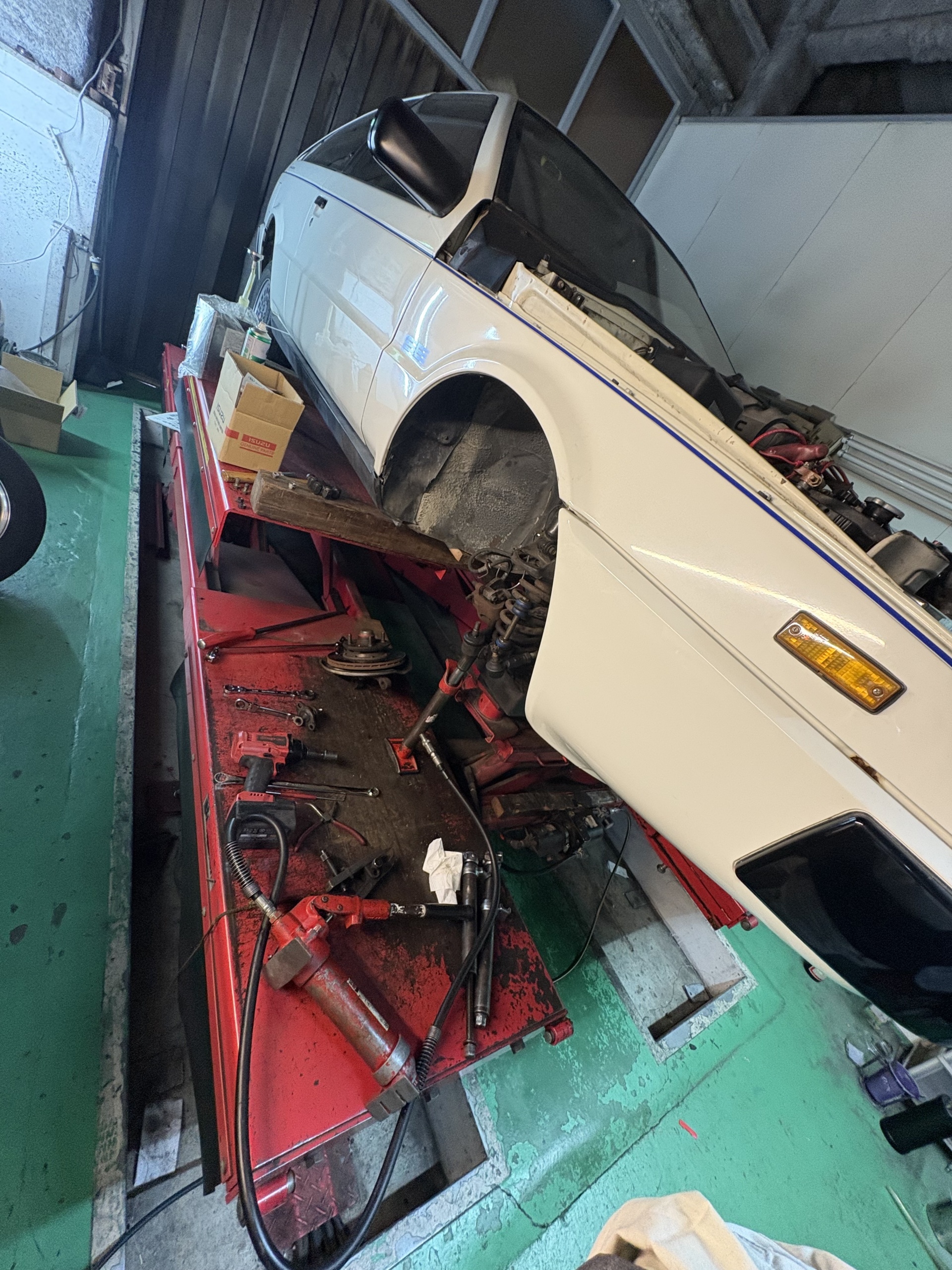 逗子海岸で発生したトラブルにより走行不能となり、レッカー車で工場に運び込まれたピアッツァ。