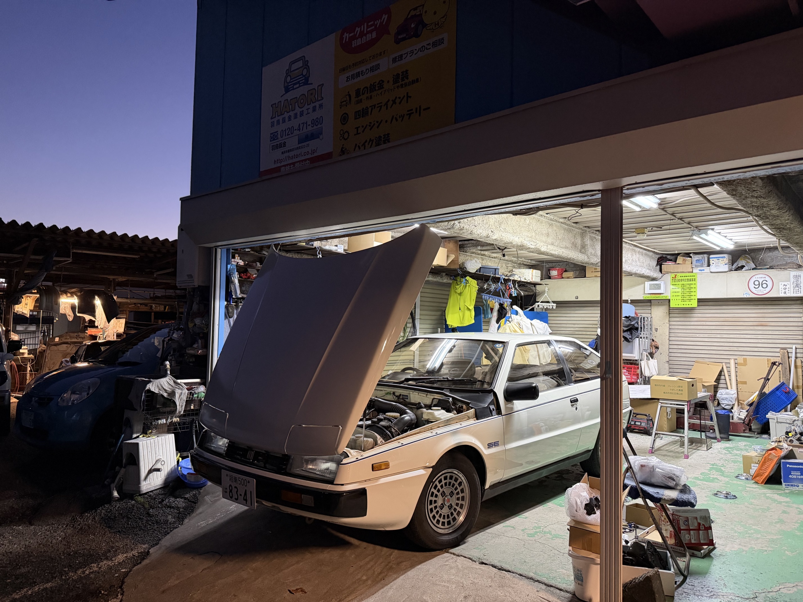 駅から歩くこと約25分。工場に着くと、作業場にピアッツァが鎮座していた。何の関係もないボンネットが開いているのは、弱ったバッテリーを充電しているため。ありがたい。