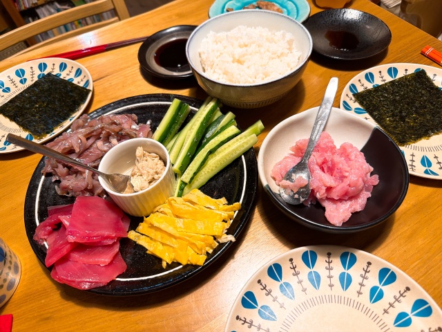 無事の帰還を祝って、晩飯は手巻き寿司にした。