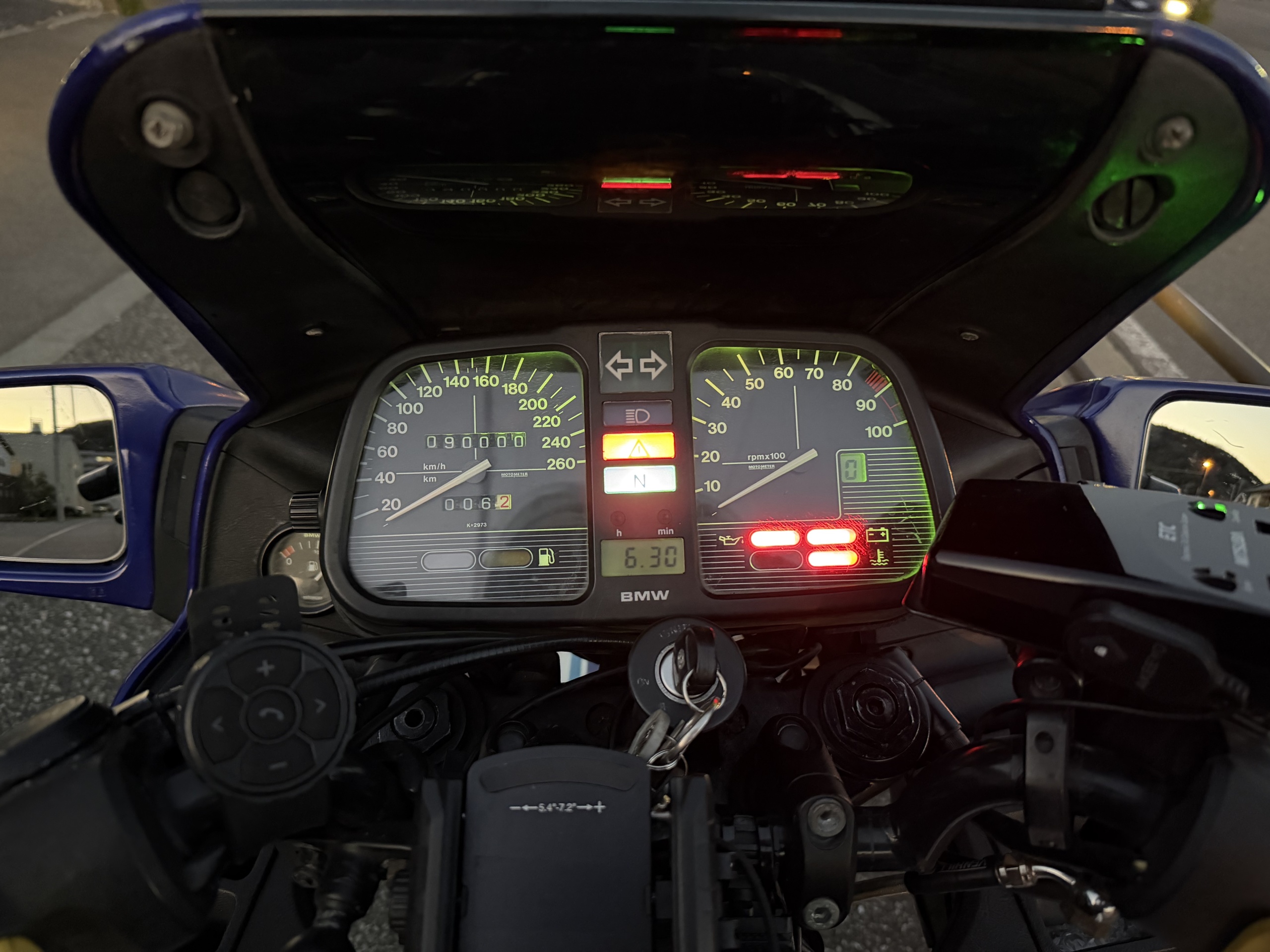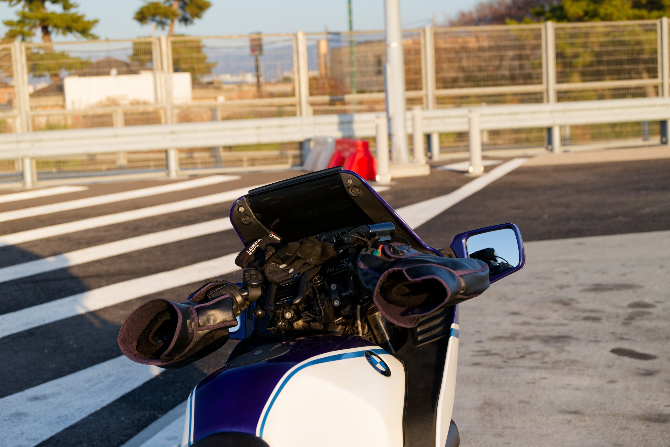 電熱ベストにモバイルバッテリーを繋ぎ、さらに必殺技の原チャリ用ハンドルカバーを装着する。そして走り出すと…ウインカーが激しく操作しづらい。原チャリとはスイッチの位置関係が違うとか、そもそもKの、というか古いBMWのウインカー周りは独特だとかいう問題はあるだろうけど、とにかく操作しづらい。これはウインカー操作を避けるために車線変更すらせず、ひたすら左車線を走るしかない。
