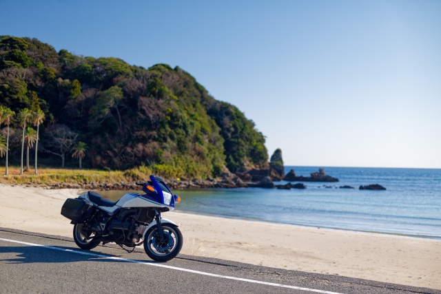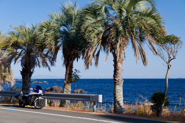 石廊崎は特に観光する気がないので素通りし、その後の素朴な漁港や椰子の木もやっぱり素通り。反時計回りだと停めようがないので結果的に走りに徹することになる。結局全く停まらないまま弓ヶ浜に着いてしまった。まあそれはそれでいいのかもしれない。