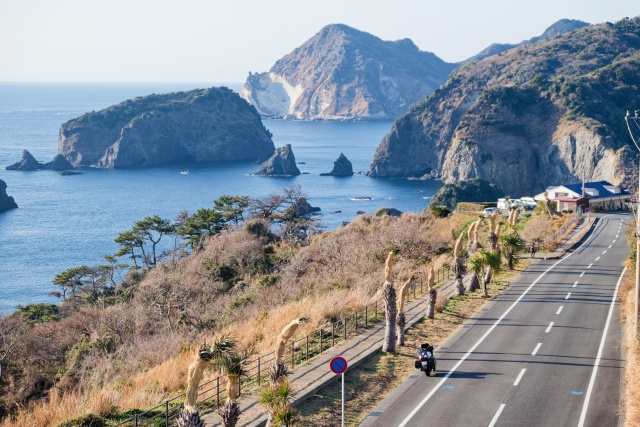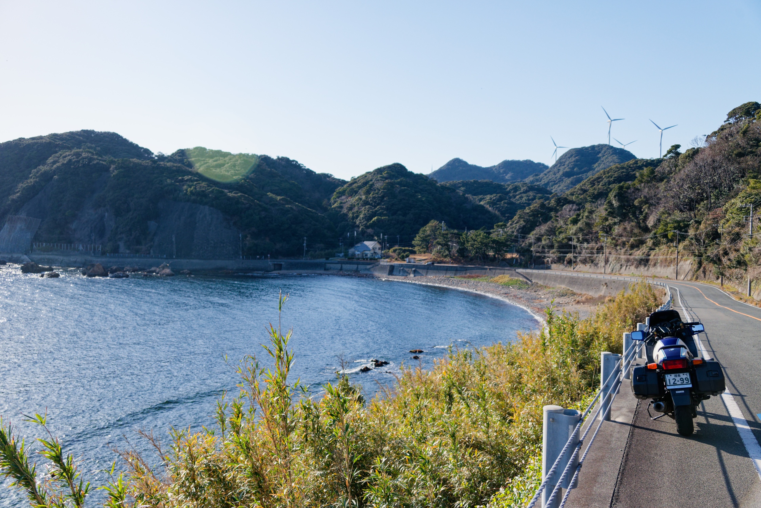 さらに進むとR136は南伊豆町の市街地や道の駅方面に行ってしまうので、交差点を反対方向に曲がって県道16号マーガレットラインに入る。しばらくは山の中を走り、ヒリゾ浜で有名な中木集落を過ぎたところで高度を上げて海沿いの崖っぷちを走る道になる。ここは良い景色ではあるけど、反時計回りだと路肩に停めて撮影するわけにもいかず結局素通りになる。