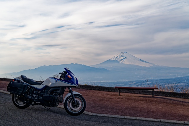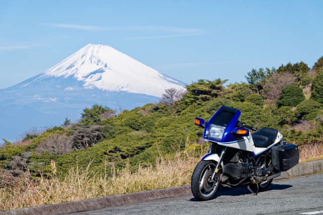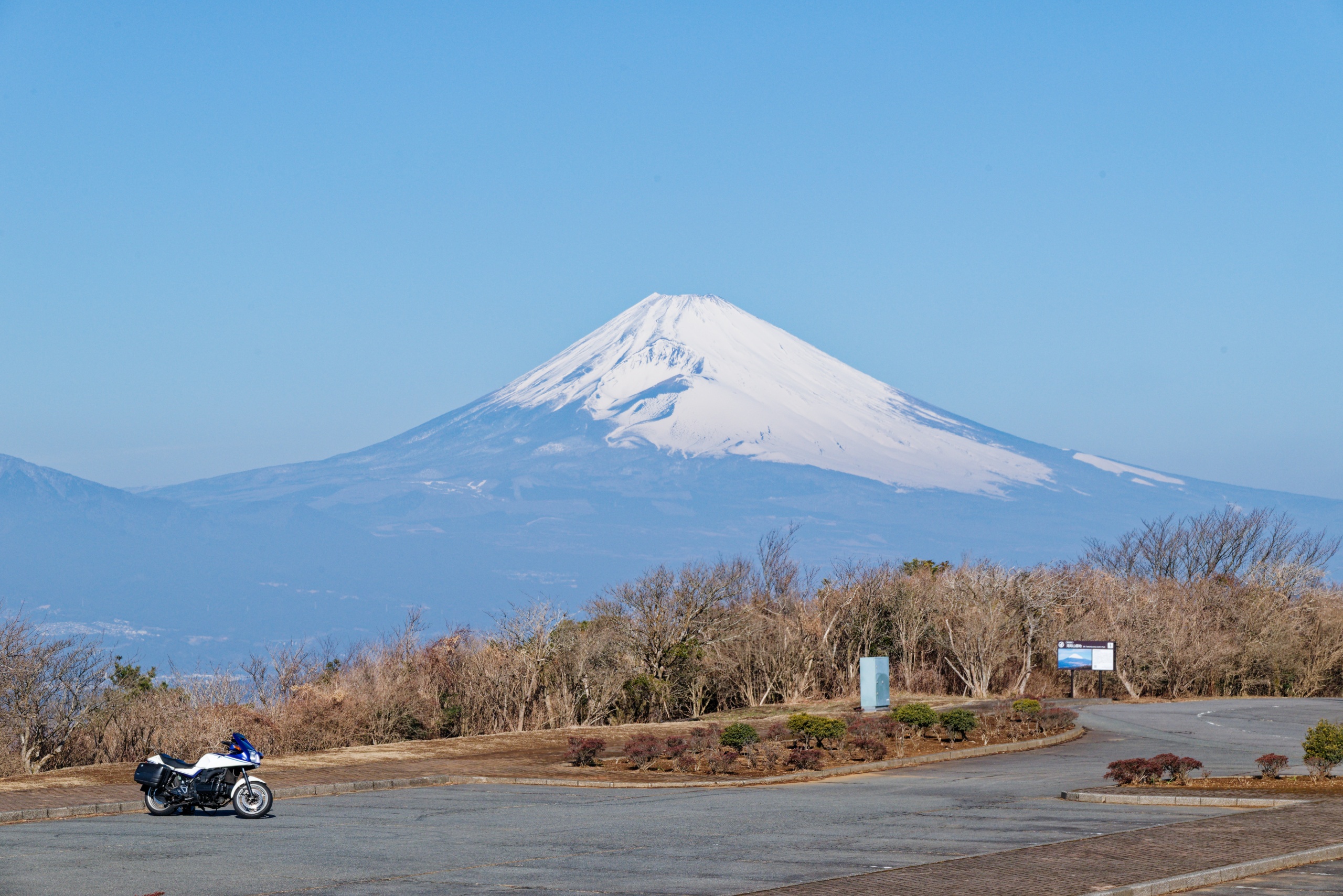 この先は景観も天気もパッとしないので基本的に走りに徹する。単純に楽しい道だ。冷川、亀石峠と過ぎ、往路では素通りした富士山が見えるPに停める。